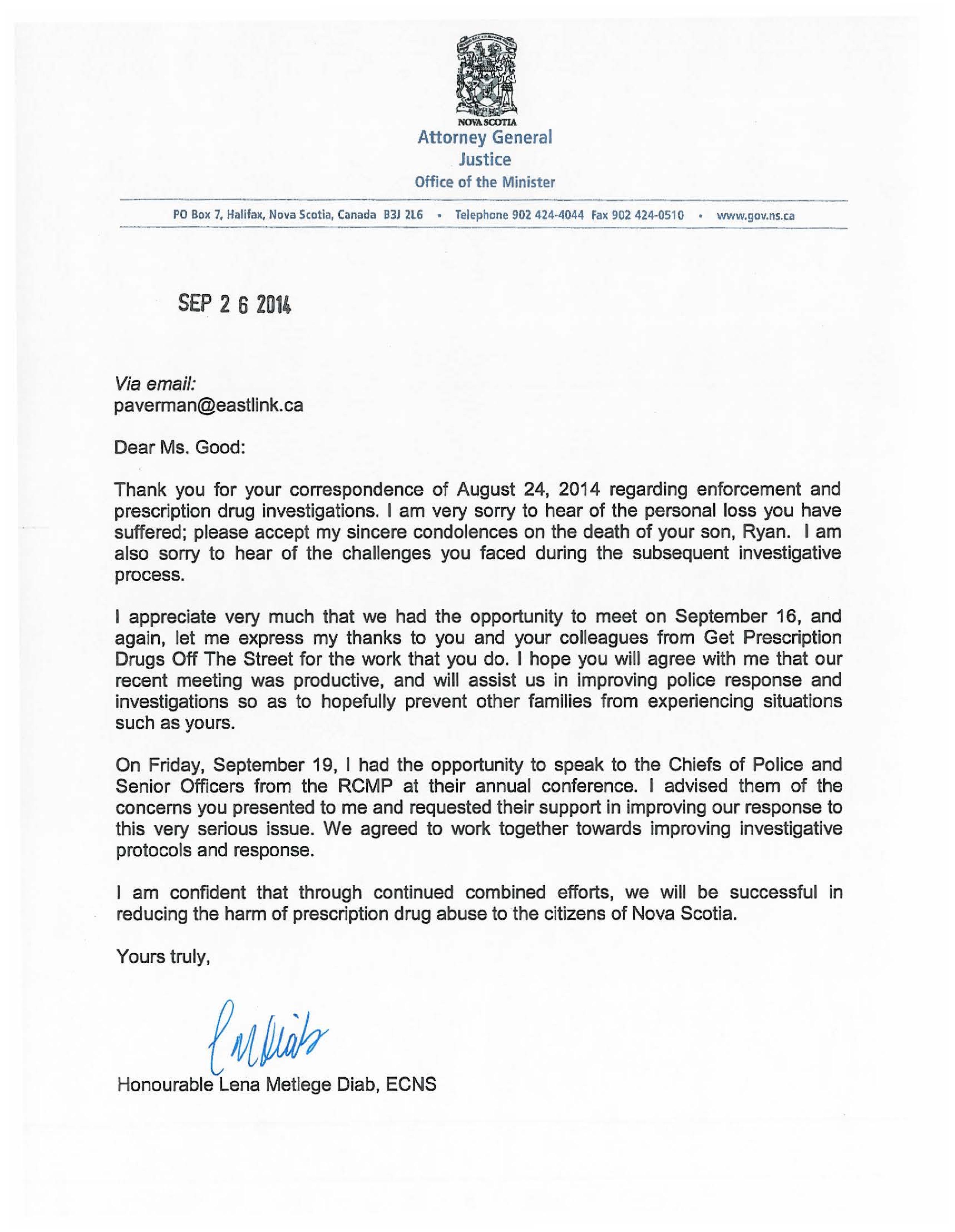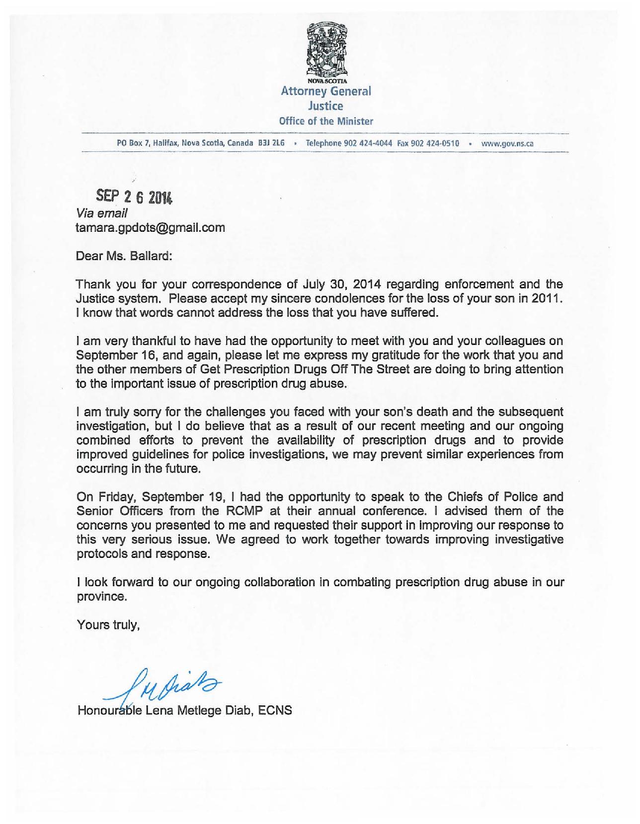 Letters To Government Letters from Justice Minister Lena Diab after meeting with GPDOTS October 1, 2014October 1, 2014 amyngraves See previous correspondence and Get Prescription Drugs off the Street Societies concerns here <—— Rate this:Share this: Click to share on X (Opens in new window) X Click to share on Facebook (Opens in new window) Facebook Click to email a link to a friend (Opens in new window) Email Click to share on LinkedIn (Opens in new window) LinkedIn Click to share on Reddit (Opens in new window) Reddit Click to share on Pinterest (Opens in new window) Pinterest Click to share on Tumblr (Opens in new window) Tumblr Like Loading... Related Share this: Click to share on X (Opens in new window) X Click to share on Facebook (Opens in new window) Facebook Click to email a link to a friend (Opens in new window) Email Click to share on LinkedIn (Opens in new window) LinkedIn Click to share on Reddit (Opens in new window) Reddit Click to share on Pinterest (Opens in new window) Pinterest Click to share on Tumblr (Opens in new window) Tumblr Like Loading...